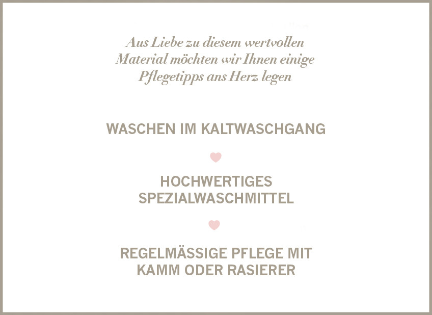 Um Ihnen eine langanhaltende Freude an ihren Cashmere-Produkten zu bewahren, möchten wir ihnen einige Pflegetipps ans Herz legen: